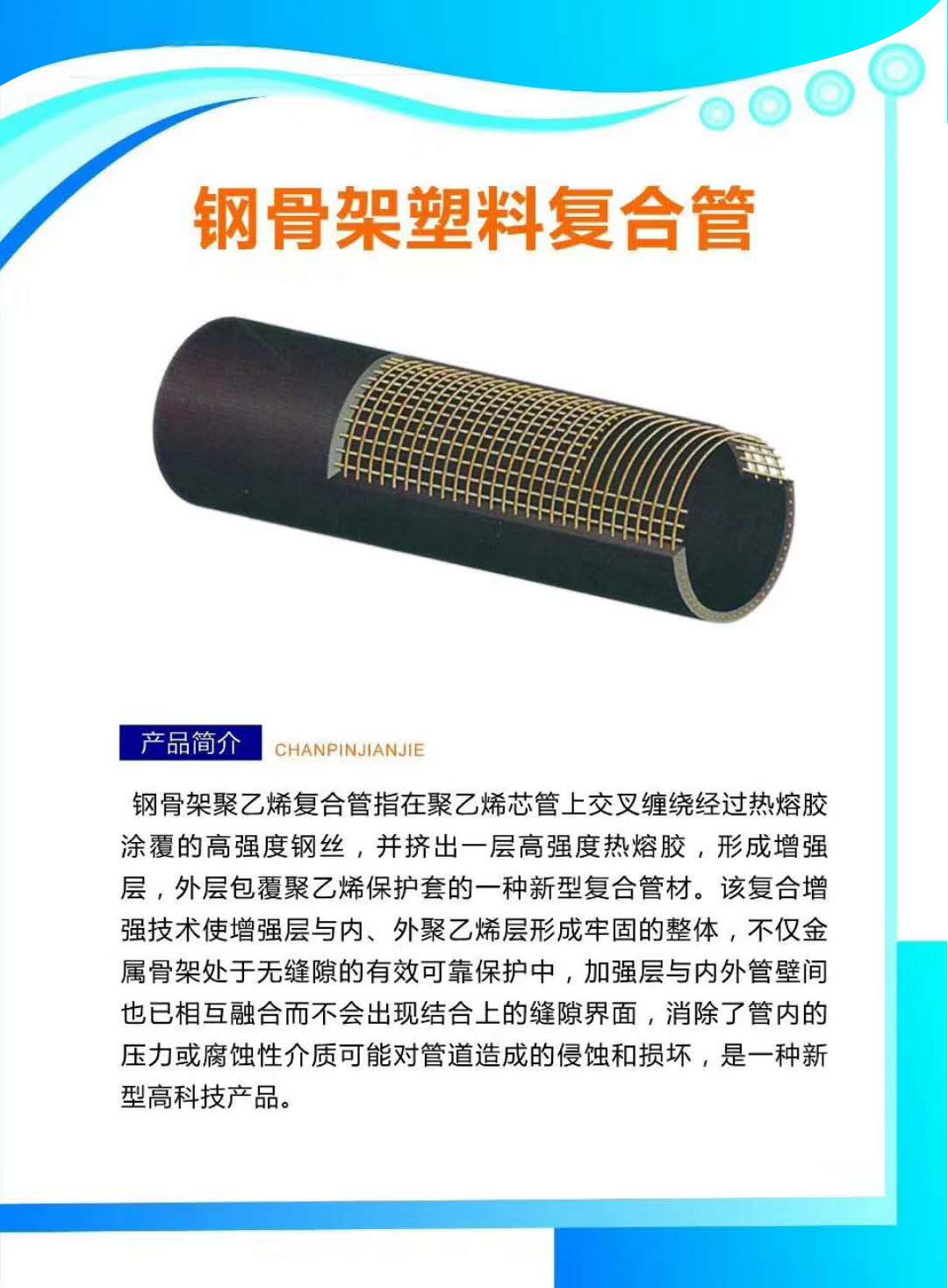 產品名稱:鋼骨架塑料復合管 產品類別:工程項目系列>>鋼骨架塑料復合管 咨詢電話: 022-27644893 技術參數: 可定制