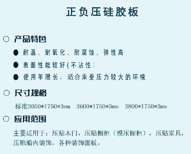 產品名稱:正負壓硅膠板 產品類別:橡膠制品系列>>正負壓硅膠板 咨詢電話: 022-27644893 技術參數: 標準3050*1750*3mm;3600*1750*3mm;3800*1750*3mm(可定制)